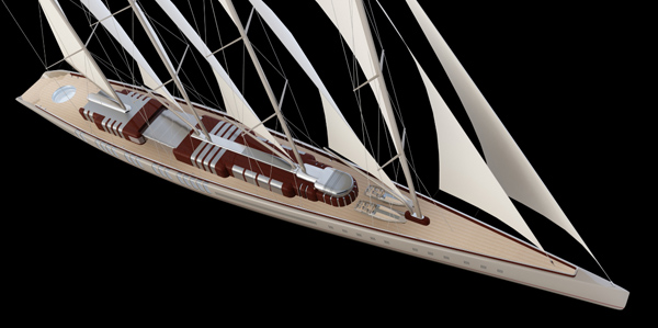 A quite extraordinary yacht, building in wood to achieve quite unique characteristics, Symphony will be without exception the largest privately sailing yacht in the world. A four masted schooner incorporating a high tech version of the unique Hoyt booms, the yacht includes some very unique features, including a large sliding roof over the central guest cockpit to ensure that it can be used all year round irrespective of the weather, an all glass swimming pool bringing light and interest to the gymnasium, with a rising swimming pool platform which, when up, extends the available deck space for receptions and events, as well as becoming an integral part of the helicopter landing platform.